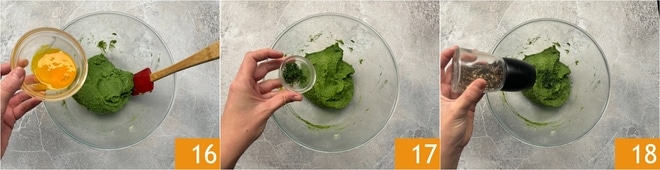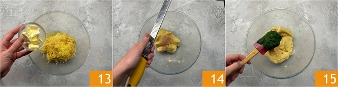 Añadan la mantequilla 13, mezclando inmediatamente para que se derrita. Sazonen con nuez moscada rallada 14 y sal, luego incorporen el puré de espinacas 15.