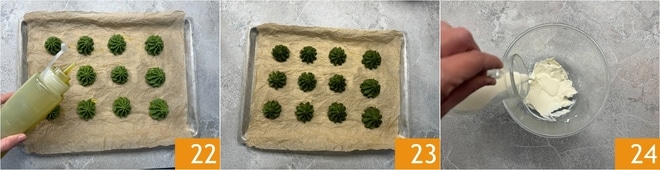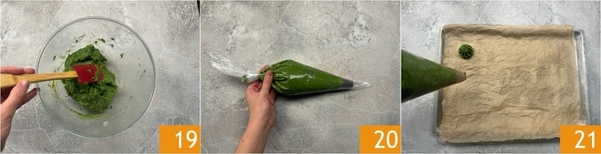 Mezclen bien con la espátula 19 y transfieran a una manga pastelera con boquilla de estrella de 12 mm 20. Mantengan en el refrigerador mientras el horno alcanza la temperatura, la mezcla debe estar fría en el momento en que formen las duquesas. Exprímanlas bien espaciadas sobre una bandeja forrada con papel de horno 21, necesitarán un par de hornadas.