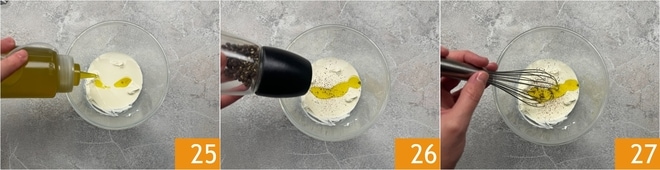 Sazonen con aceite 25, sal y pimienta 26. Mezclen enérgicamente con unas varillas 27.