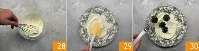 Deben obtener una consistencia cremosa 28. Extiendan la crema de queso sobre un plato de servir 29, luego coloquen encima las duquesas verdes 30.