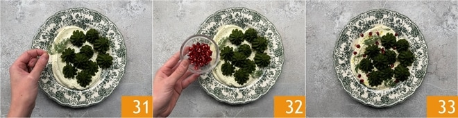 Decoren con ramitas de eneldo 31, granos de granada 32 y pimienta al gusto. ¡Las patatas duquesa con espinacas están listas para ser servidas 33!