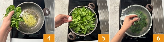 Agreguen las espinacas 4 y condiméntenlas con una pizca de sal 5. Cubran con la tapa 6 y déjenlas marchitar.