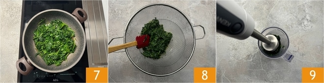 Cuando las espinacas estén cocidas 7, transfieranlas a un colador para que se sequen, presionándolas ligeramente 8. Tritúrenlas con la batidora de inmersión 9.