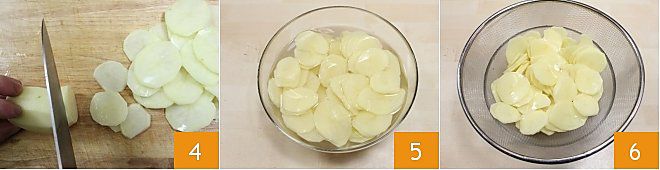 Finalmente, pela y corta las patatas en rodajas igualmente gruesas de ½ cm 4, asegurándote, a medida que obtienes las rodajas, de conservarlas en un recipiente lleno de agua fría para evitar que se oscurezcan 5. Luego, déjalas escurrir en un colador 6.