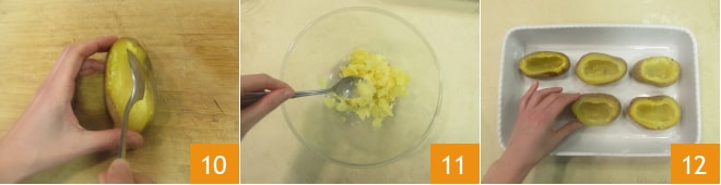 Vaciad ambas con una cuchara teniendo cuidado de no perforar la parte más grande porque servirá de envoltorio 10. En un cuenco, verted la parte vaciada 11. Poco a poco, colocad las cáscaras de patata en una fuente para horno 12.