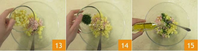 Agregad a la pulpa de patata el jamón, la fontina 13, la sal, la pimienta, el perejil picado 14 y un chorrito de aceite 15.