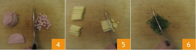 Mientras tanto, cortad el jamón cocido 4 y la fontina sin corteza, ambos en cubos de aproximadamente 1 cm 5. Finalmente, picad el perejil 6.
