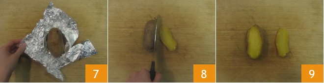Cuando haya pasado el tiempo necesario, comprobad si las patatas están cocidas con la ayuda de un palillo: si llega al centro fácilmente, entonces se consideran cocidas. Quitad el papel de aluminio 7 y luego cortad la parte superior de las patatas 8 de modo que una sea más grande que la otra 9.