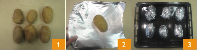 Para preparar las patatas rellenas de jamón y queso, comenzad seleccionando 6 patatas de tamaño similar, así se cocinarán al mismo tiempo 1. Envolved cada una en una hoja de aluminio 2 y colócalas separadas en una bandeja de horno. Cocinad en horno estático, ya caliente a 200°, durante unos 80 minutos 3.