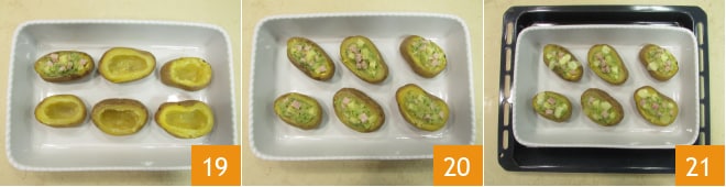 Aquí tenéis la primera lista, repetid con todas las demás 19 y estarán listas para gratinar en el horno caliente a 200°, en modo grill, colocadas en la parte alta del horno durante 5-7 minutos 20. Vuestras patatas rellenas de jamón y queso están listas para disfrutarse calientes 21.