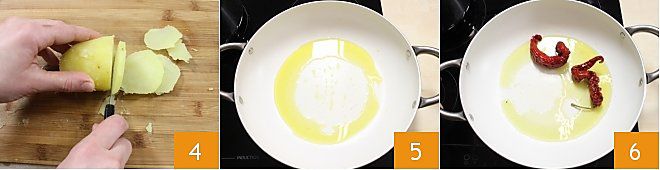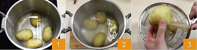Para preparar las patatas y pimientos cruschi comenzad hirviendo las patatas durante 10 minutos 1 (serán suficientes 5 minutos si utilizáis una olla a presión) para que se ablanden, pero no se deshagan 2. Pelad las patatas 3