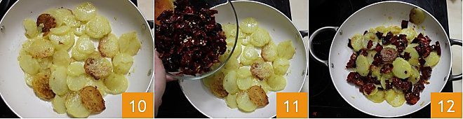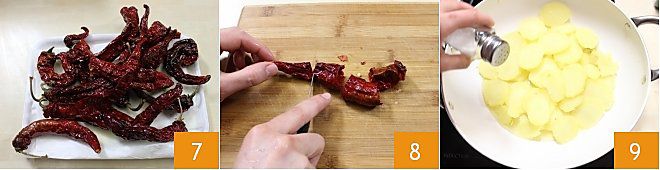 Escurrid los pimientos cruschi en una bandeja cubierta con papel absorbente 7. Cortad los pimientos cruschi en trozos no demasiado pequeños 8 y reservadlos. Ahora cocinad las rodajas de patata a fuego alto en la misma sartén y en el mismo aceite de cocción de los pimientos 9.