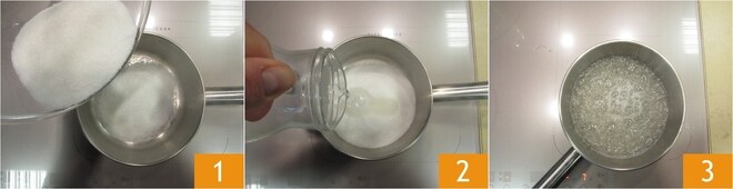 Para preparar la pâte à bombe, vierta en un cazo el azúcar 1 y el agua 2. Comience a cocinar el jarabe a fuego lento y de vez en cuando verifique la temperatura usando un termómetro de cocina, deberá alcanzar los 121°. Cuando esté a 115° 3 vierta las yemas en un bol.