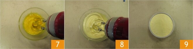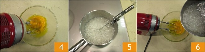 Comience a batirlas con una batidora eléctrica 4 y en cuanto el jarabe haya alcanzado los 121° 5 viértalo lentamente dentro de las yemas, siempre con las batidoras en acción, a baja velocidad 6.
