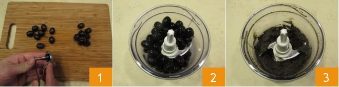 Para preparar el paté de aceitunas, empezad deshuesando las aceitunas una a una 1, ponedlas en la batidora 2 y batidlas hasta obtener una mezcla homogénea 3.