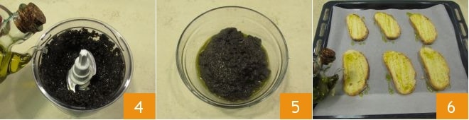 Añadid el aceite de oliva virgen extra en hilo 4 hasta que obtengáis una crema suave y suficientemente compacta 5. Vuestro paté está listo para ser servido. Podéis disfrutarlo en crujientes crostini: para prepararlos será suficiente cortar el pan, disponerlo en una bandeja de horno forrada con papel de hornear, rociarlo con un poco de aceite y tostarlo en el horno en modo grill durante 2 minutos, girándolo a mitad de cocción para tostarlo de manera uniforme. Podéis untar el paté de aceitunas negras en pan caliente con un poco de aceite cocido en el horno hasta que adquiera un color dorado 6.