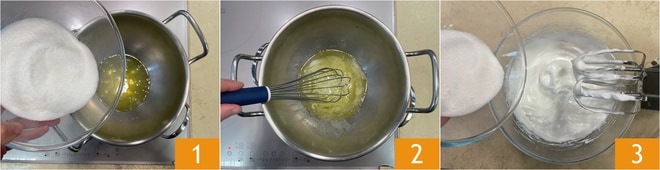 Para preparar la pavlova con chantilly y frutos del bosque, comienza con la preparación de las cáscaras de merengue. En un bol a baño maría trabaja las claras de huevo con 150 g de azúcar granulada 1, mezclando con la varilla 2 a mano hasta que alcancen los 45°. Retira del fuego, añade los otros 150 g de azúcar y bate con varillas eléctricas 3. Luego añade también el coco rallado y mezcla con la espátula de arriba a abajo.