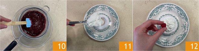 Pasa el puré obtenido por un colador para hacerlo liso 10. Puedes montar tus pavlova: en los platillos de presentación coloca la cáscara de merengue, la crema chantilly en el centro 11, decora con frutitos del bosque 12.