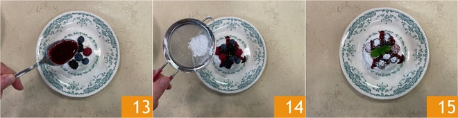 Condimenta con salsa de frutos del bosque 13 y azúcar glas al gusto 14. ¡Disfruta de la pavlova con chantilly y frutos del bosque como un delicioso postre 15!