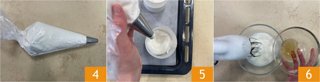 Una vez terminado, coloca la mezcla en una manga pastelera 4. Toma una bandeja, cúbrela con papel de horno, coloca los aros también forrados con papel de horno y distribuye el merengue para realizar las bases y el contorno, creando una cáscara 5. Hornea en un horno estático precalentado a 95° durante 8 horas: la cocción es suave y larga ya que el merengue debe secarse poco a poco. Mientras tanto, prepara la crema chantilly trabajando la nata fresca líquida con el jarabe de vainilla 6 y el azúcar glas, hasta que esté bien montada.