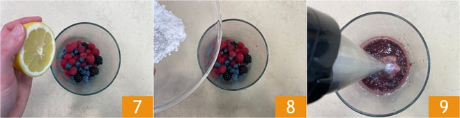 Prepara también la coulis fría de frutos del bosque triturando los frutos con zumo de limón 7 y azúcar glas 8 9.