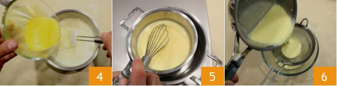 Cuando la leche y la nata hayan alcanzado el punto de ebullición, apaga el fuego y vierte la mezcla a base de huevos en la olla 4. Cocina la crema al baño maría a fuego lento, asegurándote de que el agua debajo no toque el recipiente 5. Remueve continuamente y verifica con un termómetro de cocina que la temperatura alcance los 83º. Una vez lista, filtra la crema obtenida con un colador de malla fina 6.