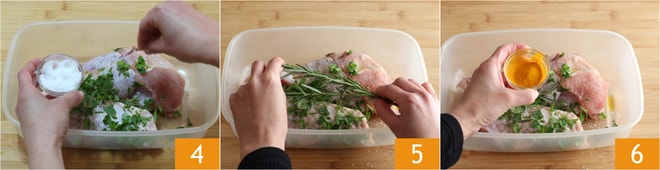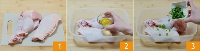 Para preparar el pavo al horno con patatas, corta en dos o 3 partes el muslo de pavo 1. Lava bien la carne y sécala con un paño. Coloca la carne en un recipiente no demasiado grande y condimenta con aceite 2, el perejil picado 3