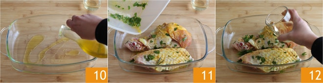 Unta con aceite una fuente para horno 10, transcurrido el tiempo de marinada del pavo, colócalo en la fuente con la marinada 11. Condimenta con el vino 12.