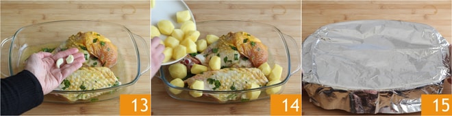 el ajo pelado 13 y el aceite. Añade también las patatas 14, cubre con una hoja de papel de aluminio y cocina a 200° en horno ventilado durante 30 minutos.