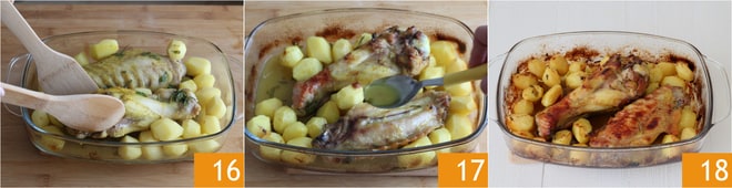 Después de 30 minutos, saca del horno, quita el papel de aluminio y dale la vuelta a los trozos de pavo. Continúa la cocción en el horno, sin papel de aluminio durante 50-60 minutos. Da la vuelta a menudo a los ingredientes para que se doren bien y riégalos con el líquido de cocción 17. Los últimos 10 minutos añade a la carne algunos trocitos de mantequilla para crear una costra en la superficie. El pavo al horno está listo para ser servido 18.