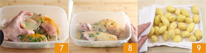 y el zumo de limón 7. Mezcla todo con las manos para cubrir la carne con los aromas. Cubre con el film transparente 8 y deja marinar durante 1 hora. Mientras tanto, lava y pela las patatas nuevas 9 y córtalas por la mitad o, si prefieres, déjalas enteras.