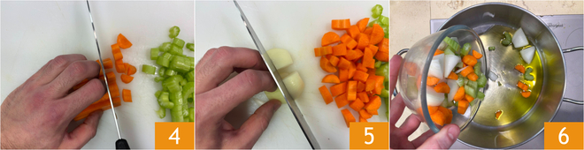 Despuntad y pelad las zanahorias, luego cortadlas primero por la mitad y luego en rodajas 4. Cortad la cebolla en cuartos 5. En una olla verted el aceite y añadid las verduras 6.