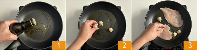 Preparar la pechuga de pollo a la sartén es rapidísimo, en primer lugar, calienta en el fuego una sartén antiadherente con un chorrito de aceite de oliva virgen extra 1 y 2 o 3 dientes de ajo enteros con piel, pero aplastados, para que den sabor sin dar un gusto demasiado persistente 2. Luego coloca las pechugas de pollo cuando el aceite esté caliente 3.