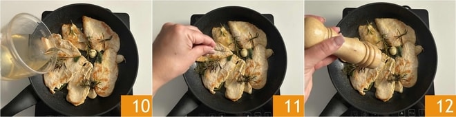 Cuando la pechuga de pollo esté dorada por ambos lados, rocía con vino blanco 10 y deja evaporar la parte alcohólica, luego baja el fuego. Ajusta de sal 11 y pimienta 12.