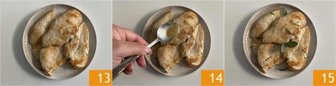 Una vez cocido, transfiérelo a un plato de servir 13 cubriéndolo con la salsa del fondo de cocción 14 y añade algunas hojas de salvia y un poco de romero 15. ¡Ahora solo queda servirlo!