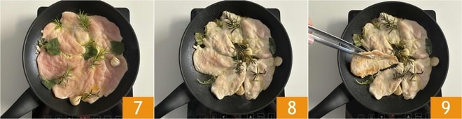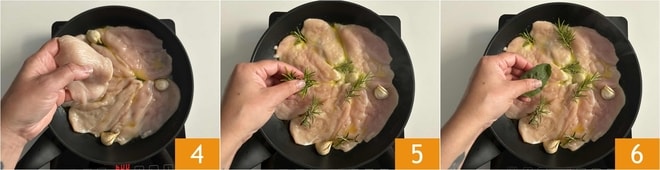 Después de agregar todas las pechugas 4, añade unas ramitas de romero 5 y unas hojas de salvia 6.