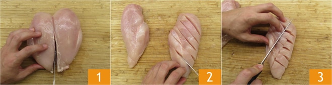 Para preparar la pechuga de pollo cremosa limpia la pechuga de pollo de grasa y huesos y divídela por la mitad 1. Con un cuchillo bien afilado haz incisiones en la superficie del pollo, sin llegar al fondo, en diagonal desde ambos lados 2 3.