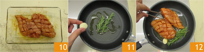 Masajea el pollo, tratando de que el condimento penetre a través de las ranuras de los cortes 10. En una sartén calienta el aceite con el romero y el ajo 11. Coloca el pollo 12. Cocina a fuego medio-alto, hasta que esté dorado en el fondo, tardará unos 6-7 minutos.