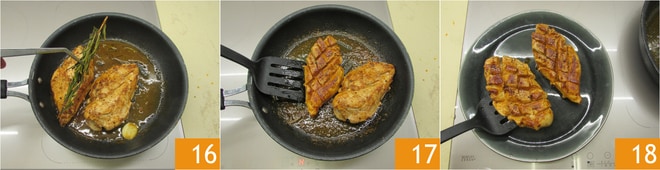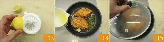 Mientras tanto exprime el jugo de limón 13. Gira el pollo y manteniendo siempre el fuego medio alto desglasa con el jugo de limón 14, cubre con una tapa y cocina también del otro lado 15 durante 6 o 7 minutos.