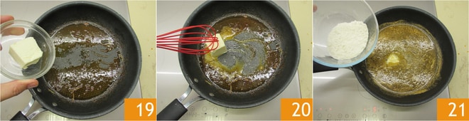En la misma sartén vierte la mantequilla 19 y déjala derretir 21. Añade la harina 21 y tuéstala mezclando con el batidor.