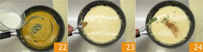 Vierte la leche a temperatura ambiente en varias veces, siempre mezclando con el batidor, y deja que espese 22. Condimenta con sal, nuez moscada 23 y romero 24.