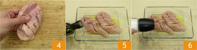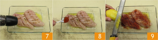De esta manera los aromas penetrarán mejor en la carne 4. En un bol condimenta el pollo con la mitad del aceite 5, sal 6,