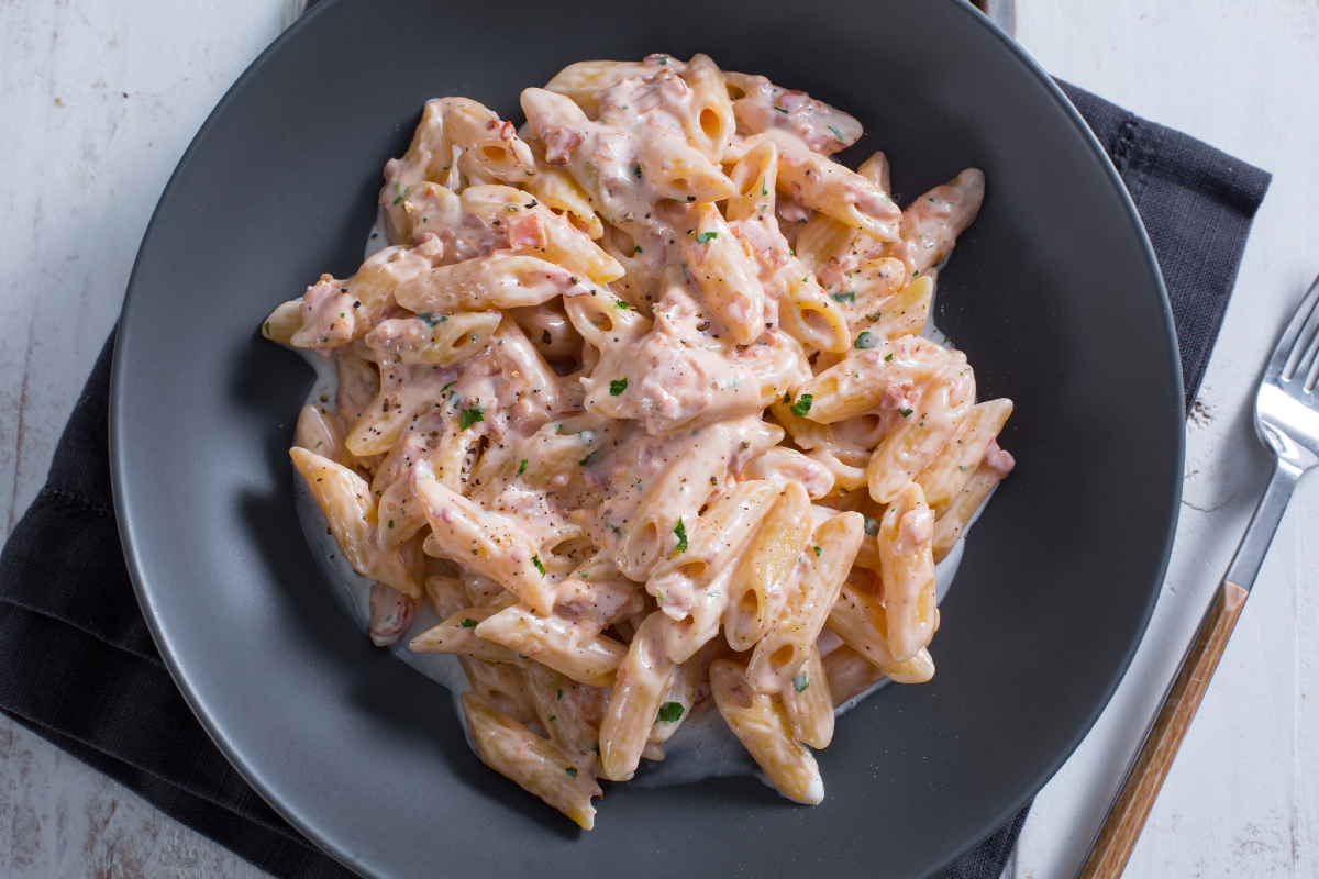 ¿Estás buscando un primer plato realmente delicioso y apetitoso listo en solo 20 minutos? ¡Aquí lo tienes! Las penne al baffo son la receta perfecta para preparar un almuerzo en familia, cuando tienes poco tiempo para cocinar pero muchas ganas de algo sabroso... y, ¿por qué no?, también cuando tus amigos hambrientos están por llegar. Pocos y sencillos pasos garantizarán un resultado espectacular... las penne son perfectas para este tipo de salsas, como la versión de alla vecchia bettola y también en este caso absorberán la crema aterciopelada a base de Nata para cocinar casera y tomate, ¡para liberarla en cada bocado! Nosotros hemos elegido enriquecer la crema con jamón cocido, pero hay muchas variantes: se puede usar speck o optar por una versión completamente diferente utilizando cubos de pescado o calamares. ¡Te recomendamos probarlas todas y elegir la que más te guste!