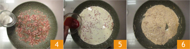 Añade también la nata 4. Mezcla todo, añade también la salsa de tomate 5, sal, pimienta y deja cocinar durante 10 minutos a fuego bajo 6.