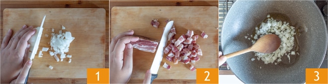 Para preparar las penne a la vodka, como primera cosa, limpie una cebolla y córtela finamente 1. Corte en cubos también el bacon ahumado 2. En una sartén, vierta el aceite, añada la cebolla 3 y sofría durante 5 minutos.
