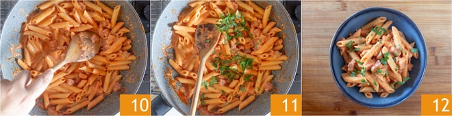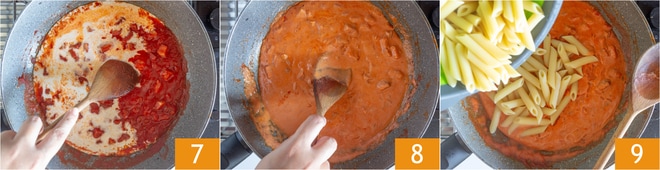 Añada la nata al condimento 7, mezcle bien 8 y deje que la salsa se reduzca durante otros 5-7 minutos. Escurra las penne al dente y transfiéralas a la sartén 9.
