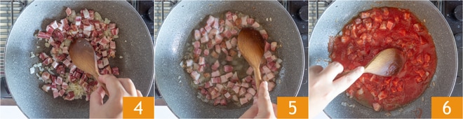 Agregue el bacon y dore durante 5 minutos 4. Desglase con la vodka 5 y deje evaporar toda la parte alcohólica a fuego medio. Luego, vierta el puré de tomate 6 y cocine, a fuego lento, durante 10 minutos. Mientras tanto, cocine las penne en agua hirviendo con sal.