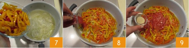 y una vez que la cebolla esté bien estofada, añade los pimientos 7, mójalos con un poco de agua y déjalos estofar durante unos 15 minutos, luego añade el puré de tomate 8 y reduce la acidez con una pizca de azúcar moreno 9.