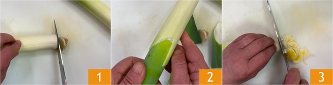 Para preparar las penne al azafrán veganas, primero corta las raíces de los puerros 1, elimina la primera capa más dura 2, luego córtalos en rodajas 3.