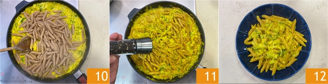 Mezcla para integrar los ingredientes 10 y termina la cocción, si es necesario añade más agua de la cocción de la pasta. Ajusta de sal y pimienta 11, luego emplata. Las penne al azafrán veganas están listas para degustar 12.